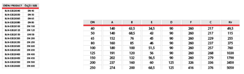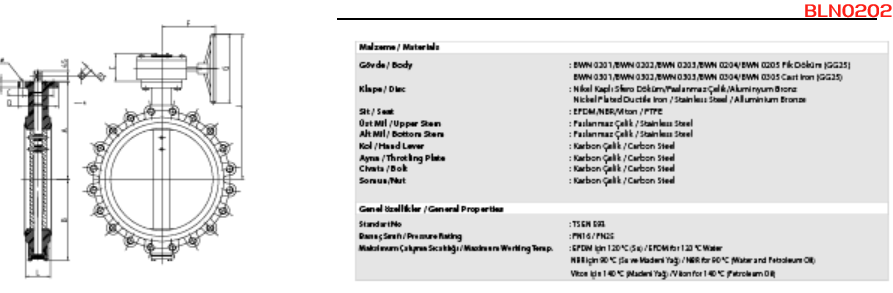 Basınç Sınıfı: PN16 / PN25 Gövde: Dökme Demir (BLN-0202) Sfero Döküm (BLN-0302) Klape: Paslanmaz Çelik Conta: EPDM veya NBR İzolasyona Uygun Boyun Dizaynı El Kumandalı (DN40...DN200) Dişli Kutulu (DN250...DN600) Lug Tip